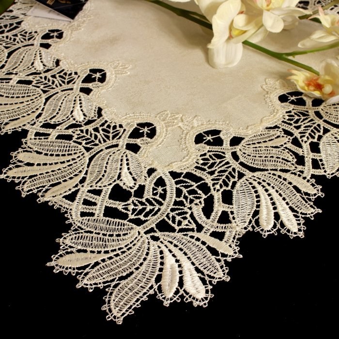 Durch die dezente Abstimmung von Spitze und Gewebe in einem hellen Champagner wirkt diese Tischdecke sehr edel und dekorativ. Die Auswahl an hochwertigen Geweben aus deutscher Produktion überzeugen jeweils durch Optik und Griff. Zusammen mit unserer eleganten Randspitze garantieren wir Ihnen auch nach häufigem Waschen immer wieder eine glanzvolle Tischkultur.